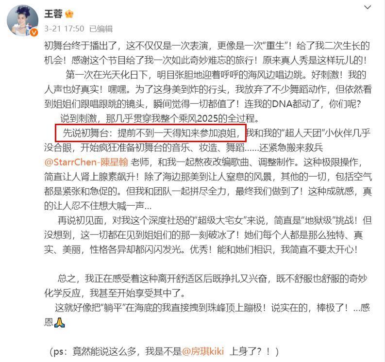 当《乘风2025》播出,王蓉在自己的社交账号发出一条消息,给网友们透露出一个重要信息,这个消息是:王蓉提前不到一天得知来参加《浪姐》,接到消息后,王蓉就开始准备舞台,她和自己的“潮人天团”小伙伴几乎没合眼,而初舞台的呈现效果,他们是非常满意的。